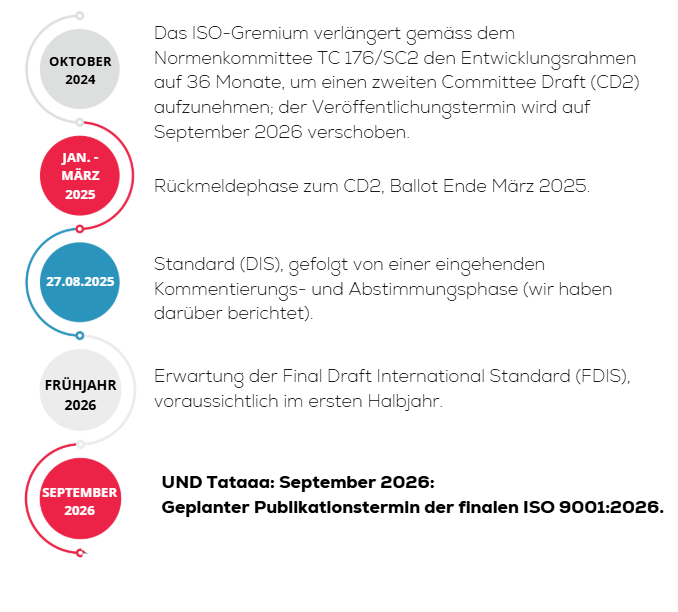 Wie schon im letzten Blogbeitrag vom Juni 2025 angekündigt, wird die ISO 9001 als weltweit zentrale Norm für Qualitätsmanagementsysteme (QMS), überarbeitet, um den heutigen Anforderungen der Arbeitswelt gerecht zu werden. Für diejenigen, die der Revision weniger entspannt entgegen blicken, good news: Statt wie auf Ende 2025 angekündigt, wird die Veröffentlichung der überarbeiteten Fassung gemäss TÜV Süd, nun für September 2026 erwartet. Den vollständigen Zeitplan für die Norm-Revision findest du ganz unten in diesem Blog.